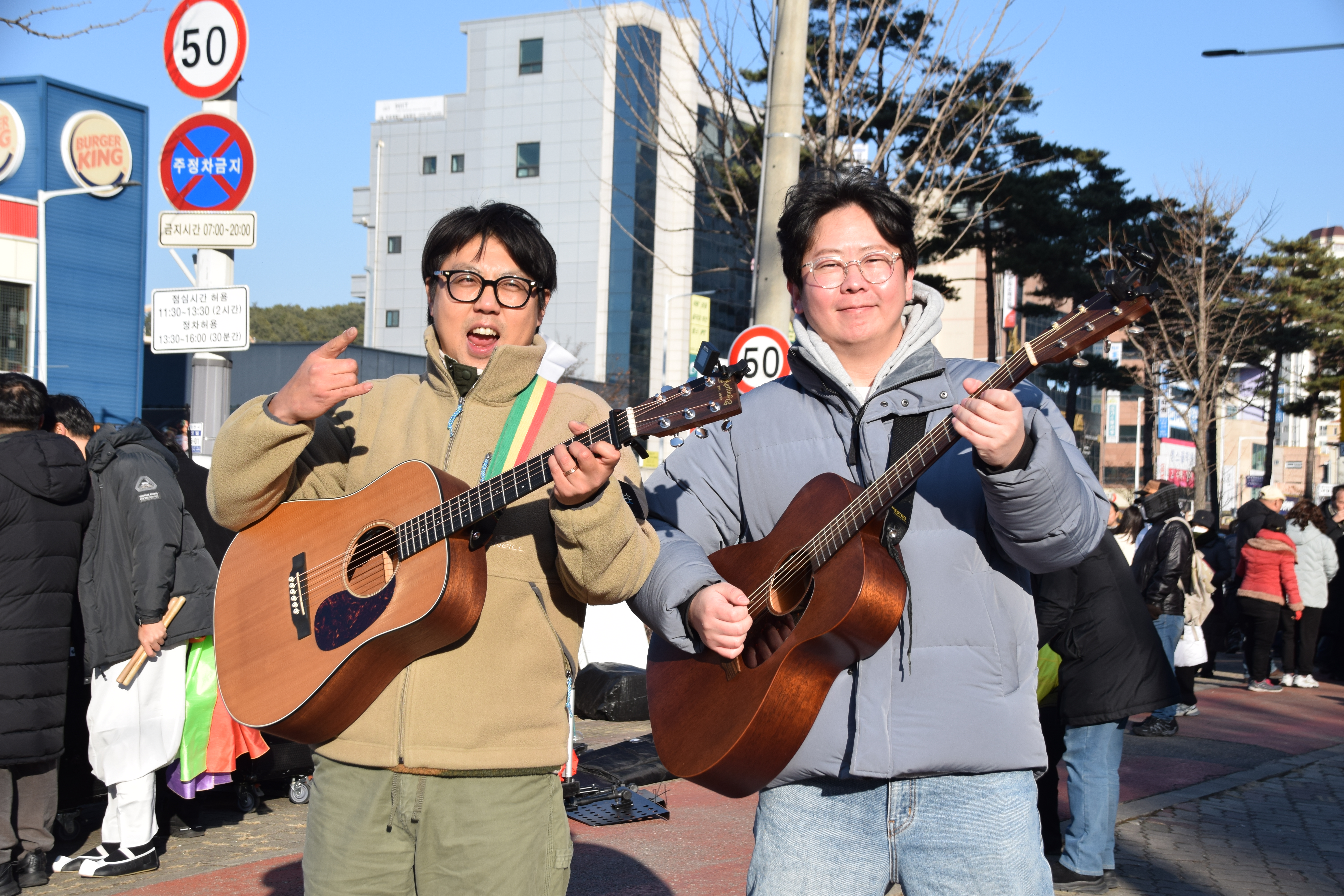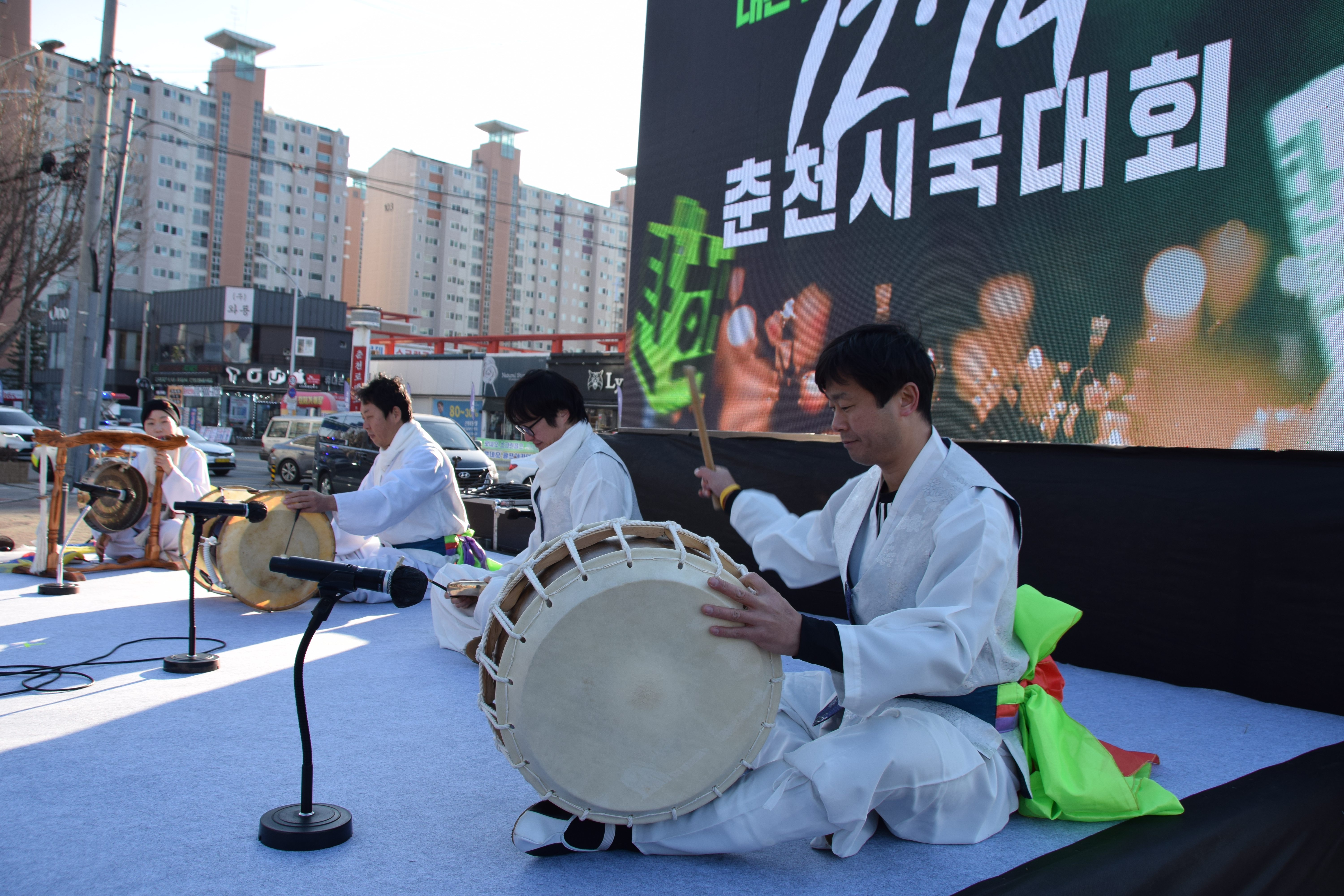여는 공연으로 강원민예총 풍물굿협회에서 사물놀이와 북놀이, 소고춤으로 열정적이고 뜨겁게 시국대회의 문을 열어주셨고 집회시위면 항상 출동하는 춘천시민연대 노래모임' 호수를 닮은 사람들'이 장미여관의 <퇴근하겠습니다>를 개사한 <탄핵당했습니다> 와 꽃다지의 <시대>는 지금 시기에 너무나 딱 맞은 노래였습니다.