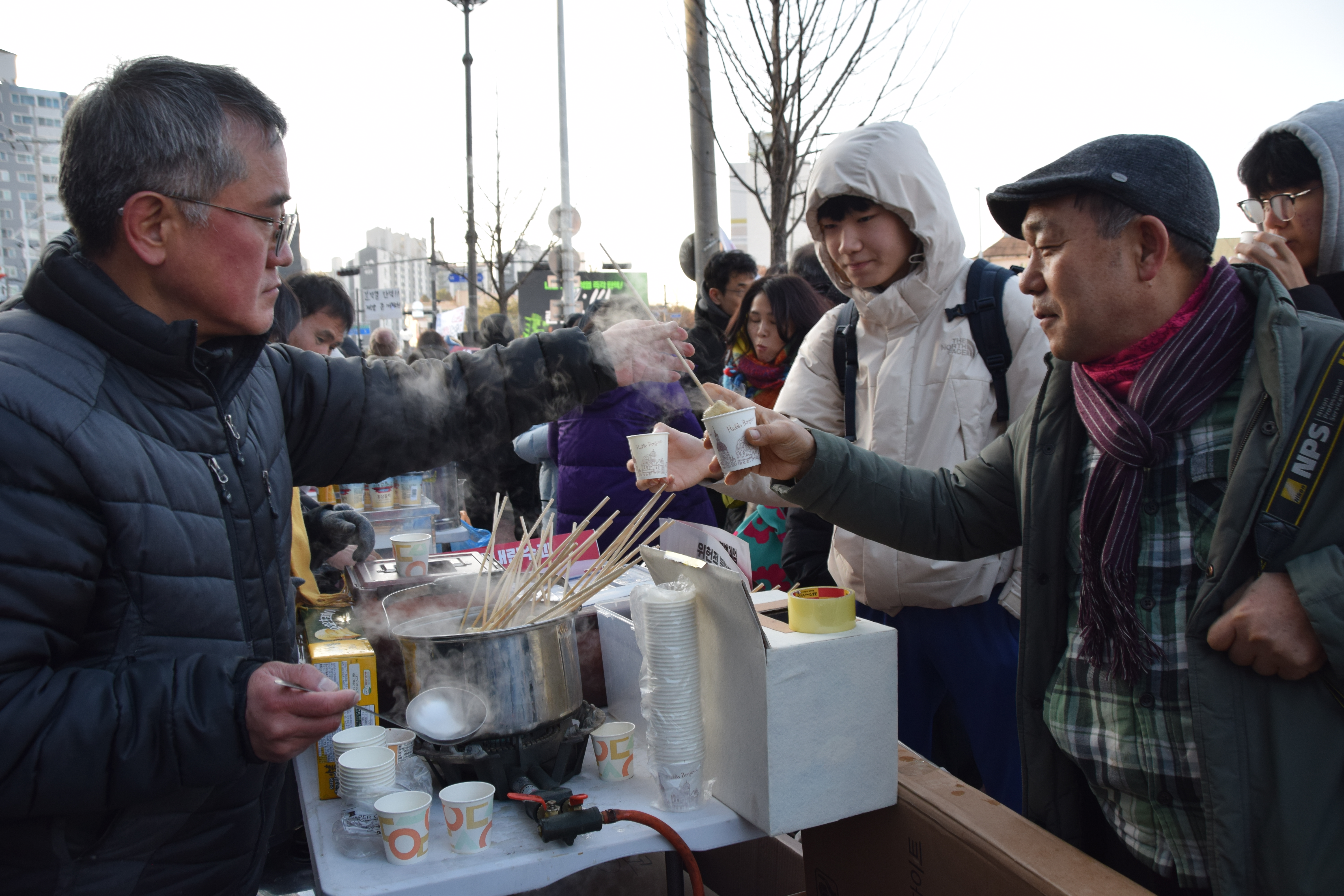 가결이후는 축제였습니다. 시민들의 후원으로 만들어진 어묵탕과 탄핵빵, 그리고 따뜻한 음료를 마시며 우리는 탄핵 축하파티를 지속했습니다. 놀지않고 이제 삼춘에서 벗어났다고 하지만 "노는 삼춘"의 공연과 이제 다 40대라지만 "아이보리코스트"의 사람들을 방방 뛰게 만드는 공연이 끝날때까지 사람들은 자리를 뜨지 않았습니다. 젊은 친구들이 노래에 맞춰 춤을 추고 서로에서 수고했다는 따뜻한 인삿말이 오갔습니다. 국민의 승리라는 말이 저절로 나옵니다.